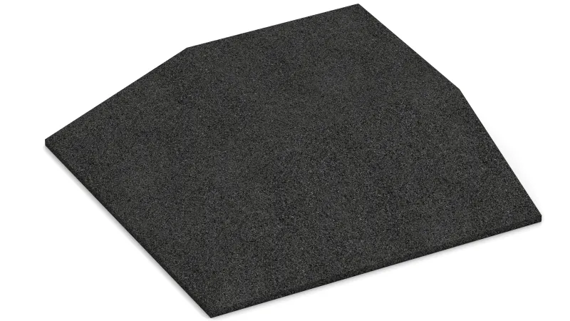 Die Eck-Platte mit zwei rechtwinklig zueinander angeordneten, keilförmig schräg ausgeformten Plattenseiten ist eine sinnvolle und systemkompatible Ergänzung zur Gummigranulat-Platte Typ FS. Die Eck-Platte wird zwischen 2 rechtwinklig zueinander liegenden Rand-Platten FI zum Ausbilden einer Ecke ohne Stolperkanten verwendet. Rand-Platten und Eck-Platten werden verwendet, wenn nur ein Teilbereich der Bodenfläche mit Gummigranulat-Platten ausgelegt wird. Durch die Eck-Platte wird der Niveauunterschied zwischen Bodenfläche und Gummiplatten-Fläche stufenlos ausgeglichen und die Gefahr von Unfällen verringert.