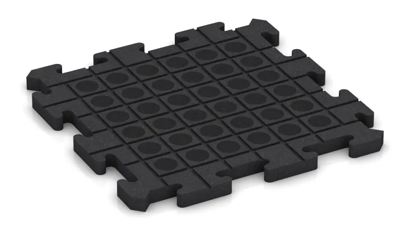 Plošče za fitnes podlago so stisnjene iz gumijastega granulata in veziva v natančne kalupe, kjer nastane puzzle spoj z rahlo zaobljenim posnetim robom. Ta zasnova zagotavlja stabilno površino in diskreten, urejen vzorec fug.