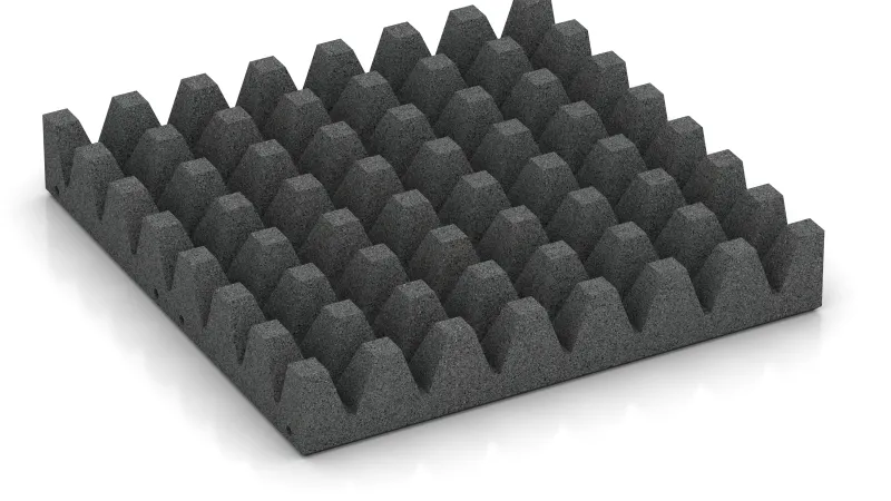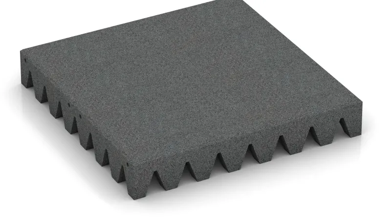 Plošče so izdelane iz PU vezanega gumijastega granulata z elastično in protidrsno površino. Debelina in gostota določata dušenje udarcev in certificirano višino padca po EN 1177. Format 50 × 50 cm zmanjšuje odpad pri rezanju, posamezne plošče pa je mogoče po potrebi hitro zamenjati.