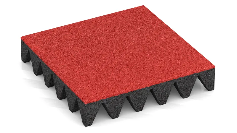 Plošče so izdelane iz PU vezanega gumijastega granulata z elastično in protidrsno površino. Debelina in gostota določata dušenje udarcev in certificirano višino padca po EN 1177. Format 50 × 50 cm zmanjšuje odpad pri rezanju, posamezne plošče pa je mogoče po potrebi hitro zamenjati.