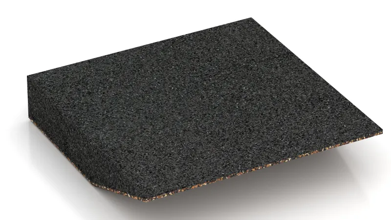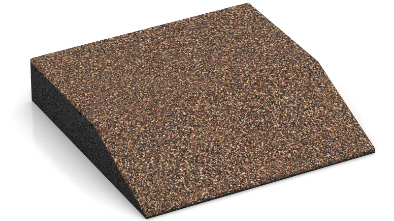 Die Rand-Platte mit einer schräg als Keil ausgeformten Plattenseite ist eine sinnvolle und systemkompatible Ergänzung zur Gummigranulat-Platte Typ FS. Die Rand-Platte wird verwendet, um Stolperkanten zu vermeiden, die am Übergang auf die Gummigranulat-Plattenfläche entstehen, wenn nur ein Teilbereich der Bodenfläche mit Gummigranulat-Platten ausgelegt wird. Durch die Rand-Platte wird also der Niveauunterschied zwischen Bodenfläche und Gummiplatten-Fläche stufenlos ausgeglichen. Unfälle durch Stolpern werden verhindert, ein leichtes Auffahren mit Rollstuhl, Kinderwagen oder Rollator wird ermöglicht.