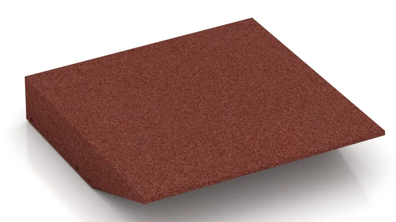 Die Rand-Platte mit einer schräg als Keil ausgeformten Plattenseite ist eine sinnvolle und systemkompatible Ergänzung zur Gummigranulat-Platte Typ FS. Die Rand-Platte wird verwendet, um Stolperkanten zu vermeiden, die am Übergang auf die Gummigranulat-Plattenfläche entstehen, wenn nur ein Teilbereich der Bodenfläche mit Gummigranulat-Platten ausgelegt wird. Durch die Rand-Platte wird also der Niveauunterschied zwischen Bodenfläche und Gummiplatten-Fläche stufenlos ausgeglichen. Unfälle durch Stolpern werden verhindert, ein leichtes Auffahren mit Rollstuhl, Kinderwagen oder Rollator wird ermöglicht.