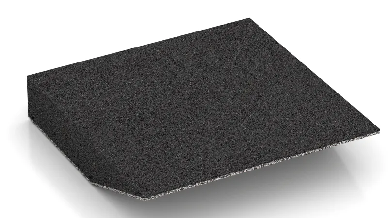 Die Rand-Platte mit einer schräg als Keil ausgeformten Plattenseite ist eine sinnvolle und systemkompatible Ergänzung zur Gummigranulat-Platte Typ FS. Die Rand-Platte wird verwendet, um Stolperkanten zu vermeiden, die am Übergang auf die Gummigranulat-Plattenfläche entstehen, wenn nur ein Teilbereich der Bodenfläche mit Gummigranulat-Platten ausgelegt wird. Durch die Rand-Platte wird also der Niveauunterschied zwischen Bodenfläche und Gummiplatten-Fläche stufenlos ausgeglichen. Unfälle durch Stolpern werden verhindert, ein leichtes Auffahren mit Rollstuhl, Kinderwagen oder Rollator wird ermöglicht.