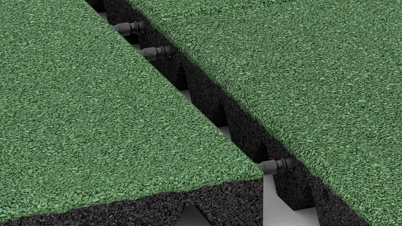 Odprta porozna EPDM-površina je UV-stabilna, protizdrsna in odporna proti obrabi – tudi na mokrih površinah. Zaradi prijetnega otipa je primerna za območja z neposrednim stikom s kožo. Spodnja stran iz granulata ELT je oblikovana z obrnjenimi piramidnimi izboklinami, ki izboljšujejo absorpcijo udarcev, omogočajo učinkovit odtok vode in pospešujejo sušenje površine – kar je še posebej koristno v spremenljivih vremenskih razmerah.