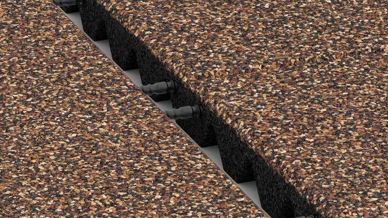 Odprta porozna EPDM-površina je UV-stabilna, protizdrsna in odporna proti obrabi – tudi na mokrih površinah. Zaradi prijetnega otipa je primerna za območja z neposrednim stikom s kožo. Spodnja stran iz granulata ELT je oblikovana z obrnjenimi piramidnimi izboklinami, ki izboljšujejo absorpcijo udarcev, omogočajo učinkovit odtok vode in pospešujejo sušenje površine – kar je še posebej koristno v spremenljivih vremenskih razmerah.