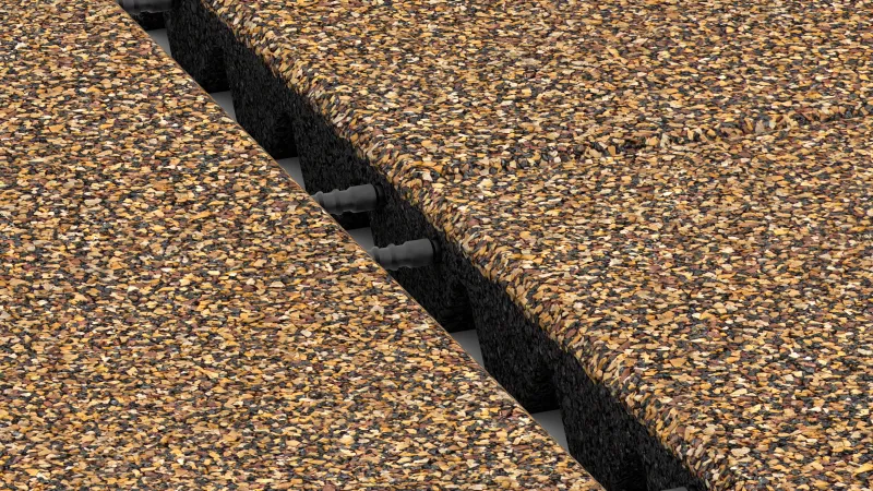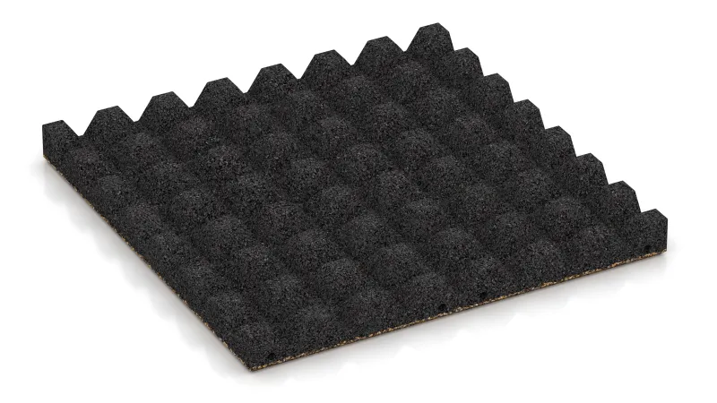 Odprta porozna EPDM-površina je UV-stabilna, protizdrsna in odporna proti obrabi – tudi na mokrih površinah. Zaradi prijetnega otipa je primerna za območja z neposrednim stikom s kožo. Spodnja stran iz granulata ELT je oblikovana z obrnjenimi piramidnimi izboklinami, ki izboljšujejo absorpcijo udarcev, omogočajo učinkovit odtok vode in pospešujejo sušenje površine – kar je še posebej koristno v spremenljivih vremenskih razmerah.